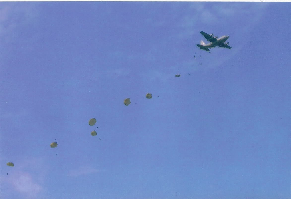 | a truly amazing sight! chutes popping behind a C-130 |